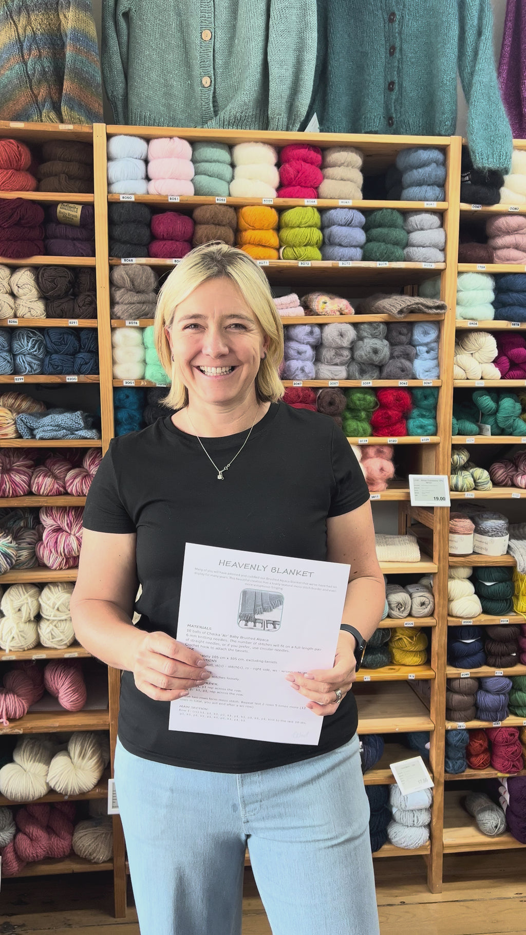Pattern included! The beautifully textured square (~ 105 cm × 105 cm excluding tassels) featuring a rich moss-stitch border and full fringe — an approachable project with a fabulous finish.